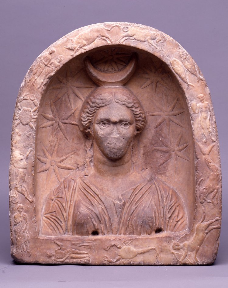 Reddish marble carved votive relief of Selene: a female bust to the front in an arched niche, draped in a sleeved chiton, and with her hair parted in the middle and brought down over her ears, nose now missing, surrounded by a crescent on her head, seven stars in the field around and the signs of the zodiac in low relief; inscribed beneath with an unitelligible Gnostic formula