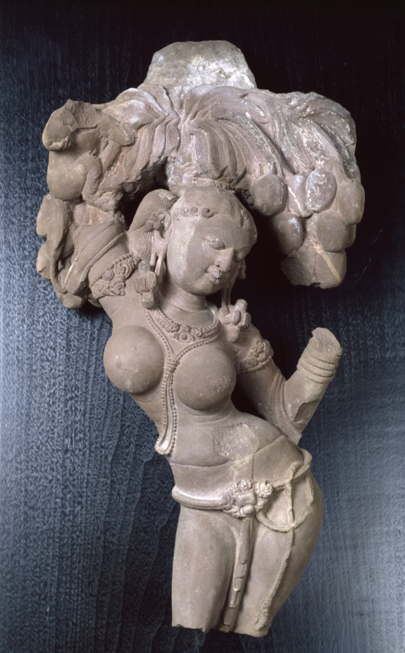The celestial woman’s body bends, as if from the weight of her breasts, just as the mango tree is pulled down by the heavy fruit. The monkey is a playful spectator of this masterful play of rounded flesh and lively strands of gems. The figure was originally placed high as a ceiling support in the hall attached to a temple sanctuary, where it suggested fertility and abundance.