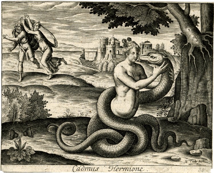 Cadmus, turned into a snake, embraced by his wife Harmonia;.illustration to Renouard’s French translation of Ovid’s ‘Metamorphoses’ (Paris, veuve Langelier, 1619, p.117); letterpress text on verso. c.1619