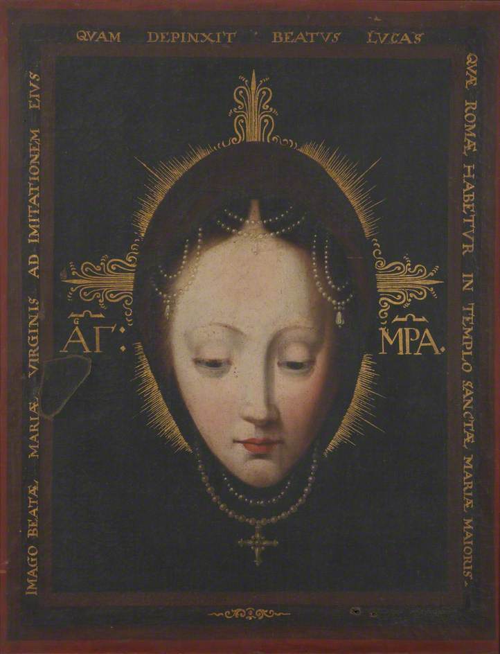 This painting, depicting the Virgin Mary, came to the Museum as part of the founding collection given to the University of Oxford by General Pitt-Rivers in 1884. One of the old catalogues describes it as a Russian icon, but the inscriptions are in Latin and Greek and its origins are uncertain. The inscription identifies it as a copy of a painting in the church of Santa Maria Maggiore in Rome, which is supposed to be a portrait painted by the Evangelist Luke, which was first mentioned in a History of the Church written in the sixth century. However, there are many portraits of Mary supposedly painted by Luke. The painting at Santa Maria Maggiore is a half-length portrait of Mary with the child Jesus on her lap and bears little resemblance to this supposed copy.