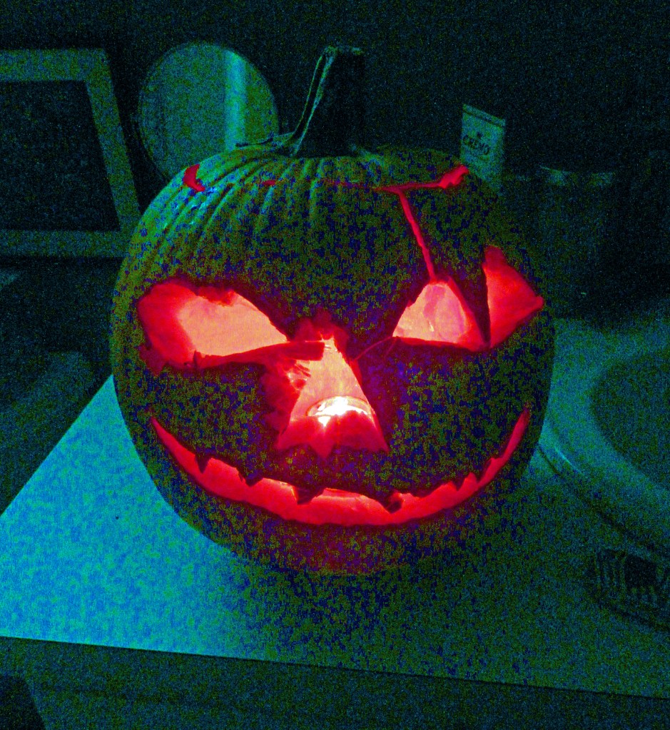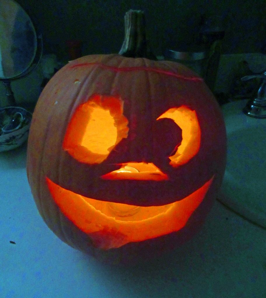 When Marcel Duchamp’s masterpiece The Large Glass partially shattered in transit, he embraced the effects of chance, declaring the symmetrical pattern of cracks an improvement. Similarly I present without amends my collaboration with the squirrels on our jack o’lanterns this year.