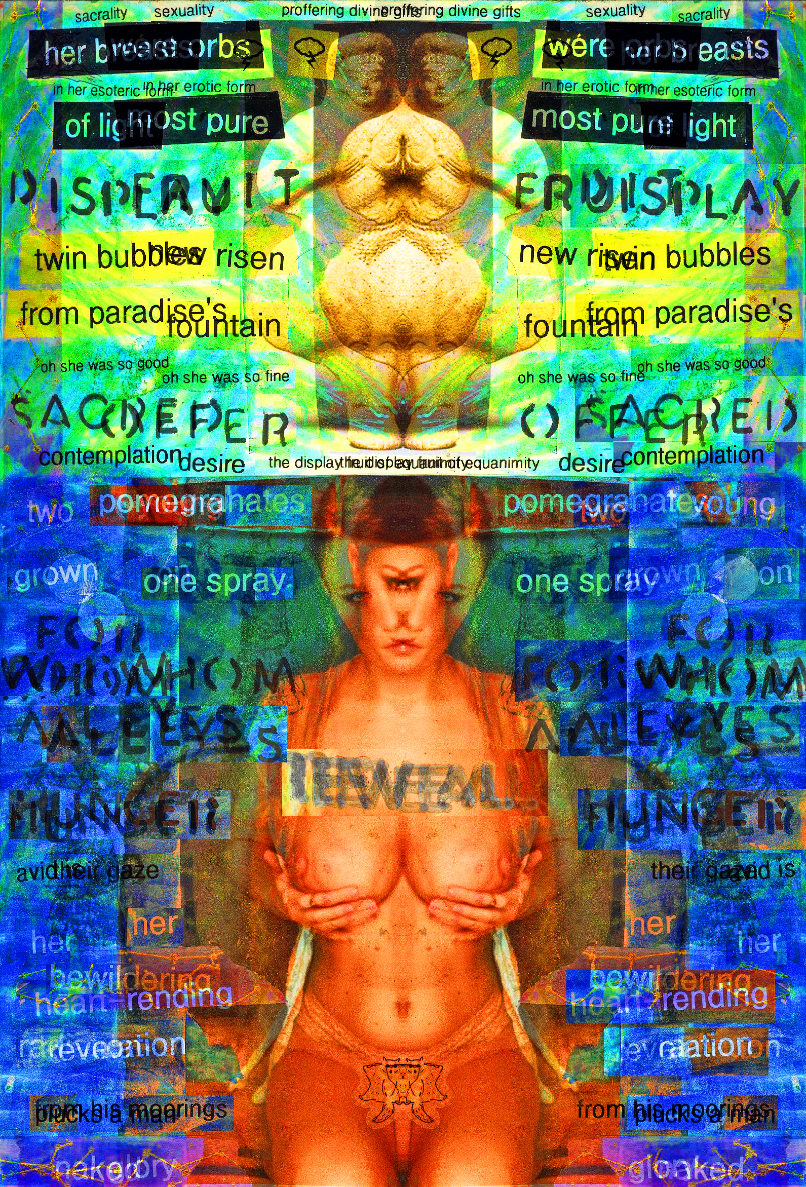 Sacrality Proffering Divine Gifts Sexuality Her Breasts Were Orbs Of Light Most Pure Display Fruit Twin Bubbles New Risen From Paradise’s Fountain O She Was So Good O She Was So Fine Sacred Offer Contemplation The Display Fruit Of Equanimity Desire Two Young Pomegranates Grown On One Spray For Whom All Eyes Hunger Reveal For Whom All Eyes Hunger Avid Is Their Gaze Her Heart-Rending Revelation Her Bewildering Radiation Plucks A Man From His Moorings Naked Glory