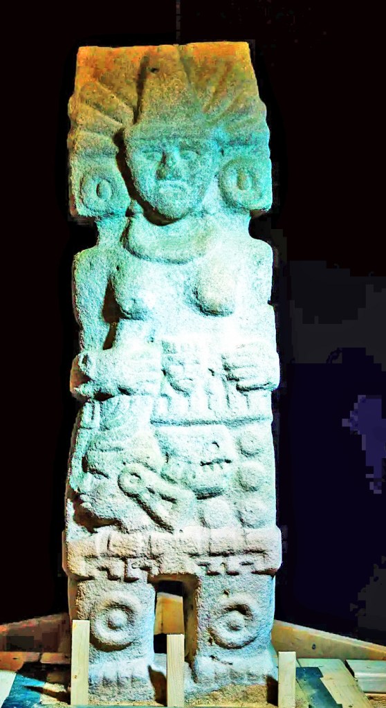 The woman, carved in pale stone, wears a peaked headdress, circular earrings and the wide hip belt and kneepads of an ancient Mesoamerican athlete. In her right hand, she grips the severed head of a sacrificial victim by the hair.